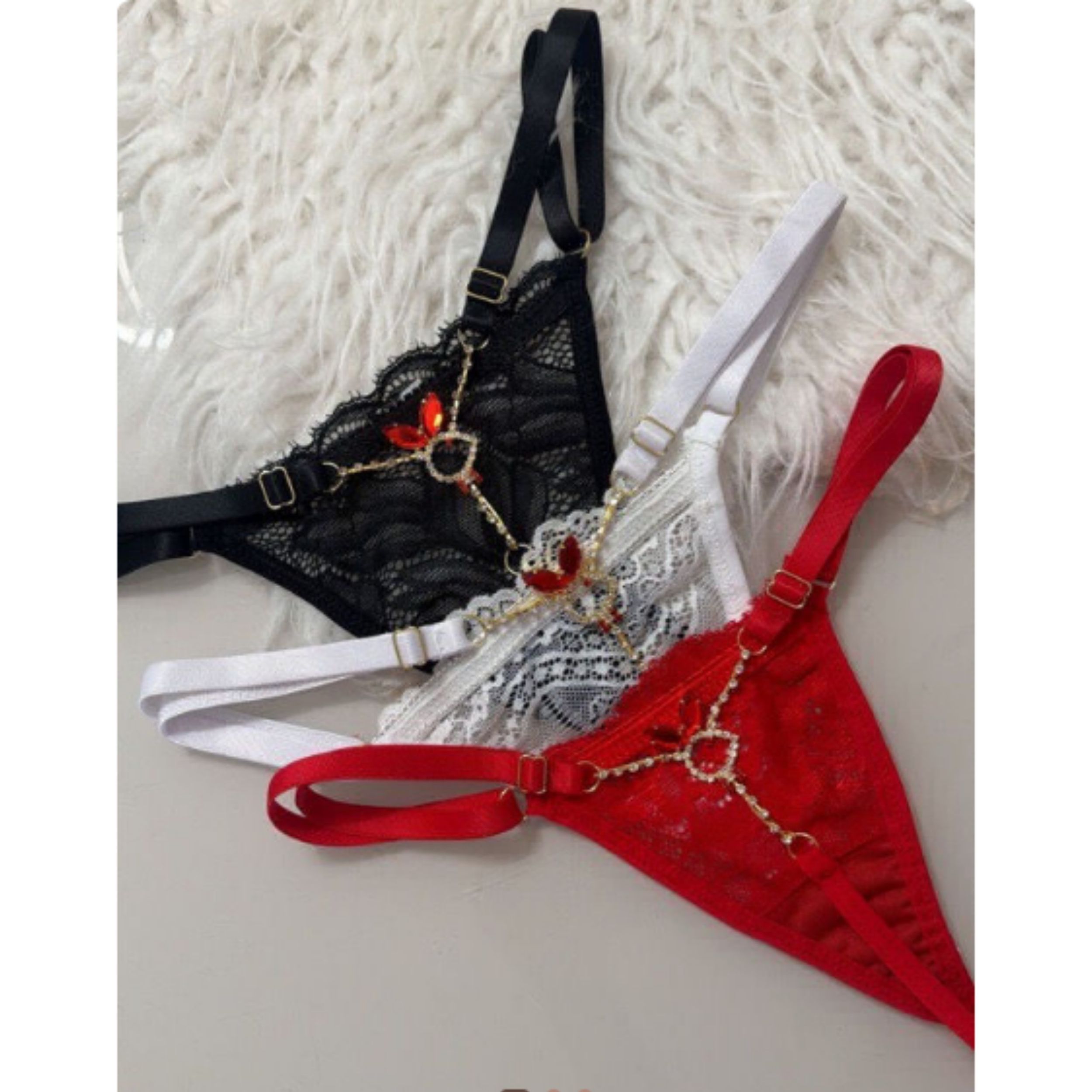Eleve sua autoestima com uma peça que é puro brilho! 🐰 Esta calcinha fio dental em renda destaca-se pela sua frente luxuosa, adornada com uma corrente de strass que forma o icônico logo da Playboy.